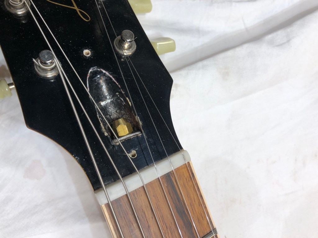 Gibsonin kaularaudat toimivat pääsääntöisesti erittäin hyvin. Ongelmia voi tulla jos jostain syystä kaula on luonnostaan paljon notkolla. Tällöin voi käydä niin kuin tässä tapauksessa, että rauta ei jaksa suoristaa kaulaa. Kaularautaa oli jouduttu kiristämään aivan äärimmilleen, jonka seurauksena kiristysmutteri oli uponnut puun sisään. Myös raudan toisessa päässä ankkuri oli painanut puuta kasaan ja koko rauta oli liikkunut ulospäin. Silti kaulassa oli notkoa keskivaiheilla millin verran.