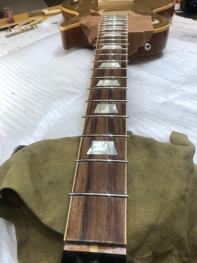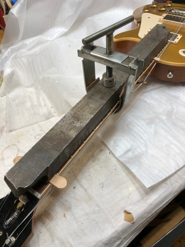 Seuraavaksi tehtiin lämpöoikaisu. Otelautaa lämmitetään, sen jälkeen kaulan annetaan jäähtyä kuperaksi puristettuna. Gibsonin tapauksessa lämpöoikaisu on haastava operaatio, koska otelautamerkit ovat selluloidia joka on herkästi syttyvää…